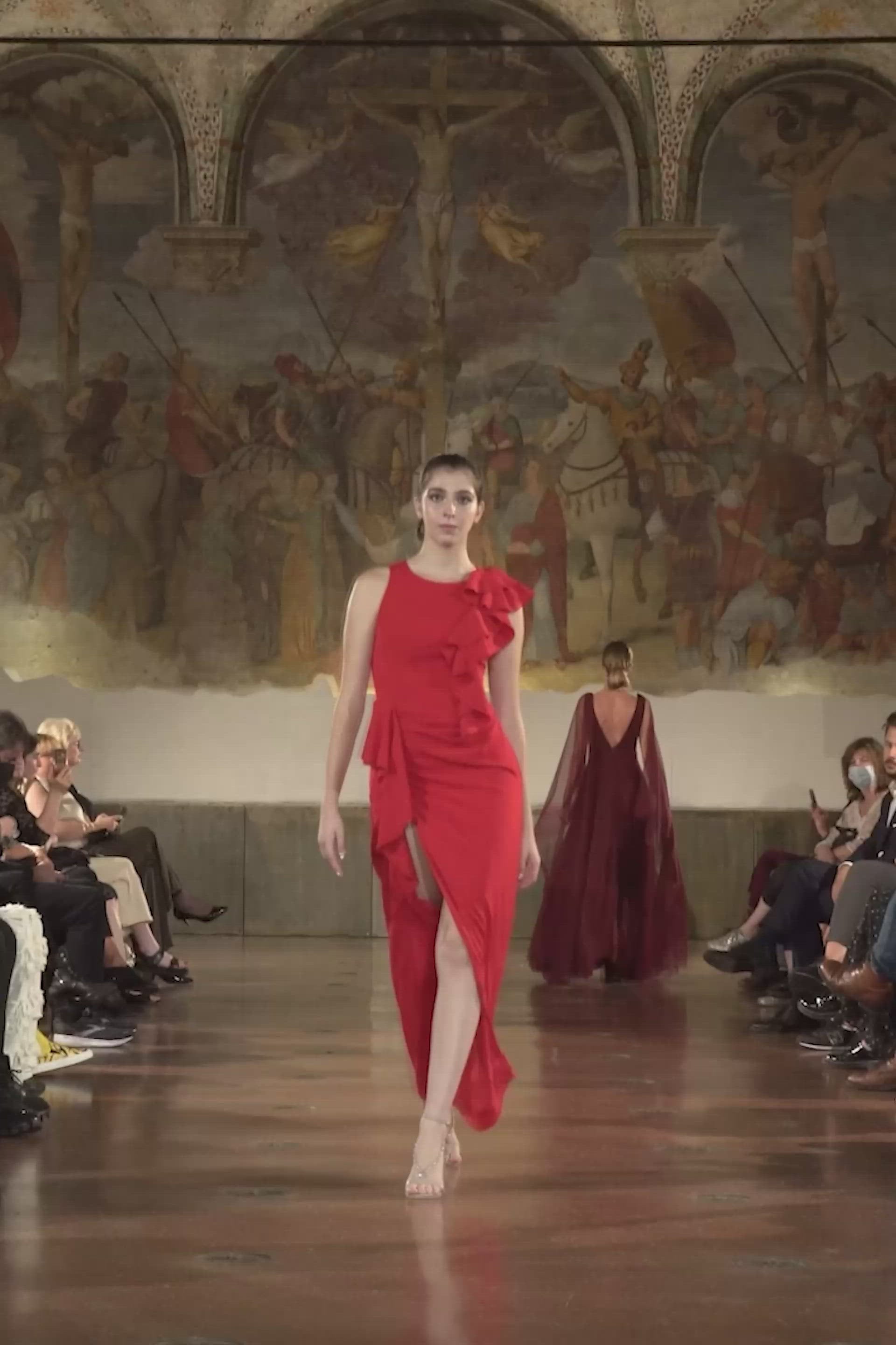 Suknia wieczorowa Luna ma elegancki, dopasowany krój z drapowaniami i asymetrycznymi falbankami. Sukienka jest wykonana z mieszanki wiskozy z rozcięciem na nogawce i ukrytym zamkiem błyskawicznym z tyłu. Asymetryczny kształt dodaje odrobinę smaczku do ponadczasowego klasycznego stylu.